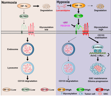 課題組前期研究發現糖基轉移酶GLT8D1受低氧轉錄因子HIF-1a誘導,調控胚胎早期中樞神經系統發育(Nature Communications,2018),并在膠質瘤干細胞的細胞膜表面特異性高表達。GLT8D1與膠質瘤干細胞標志物CD133膜蛋白直接結合,通過糖基化修飾CD133抑制其溶酶體蛋白降解途徑,進而穩定CD133的表達和膠質瘤干細胞活性。